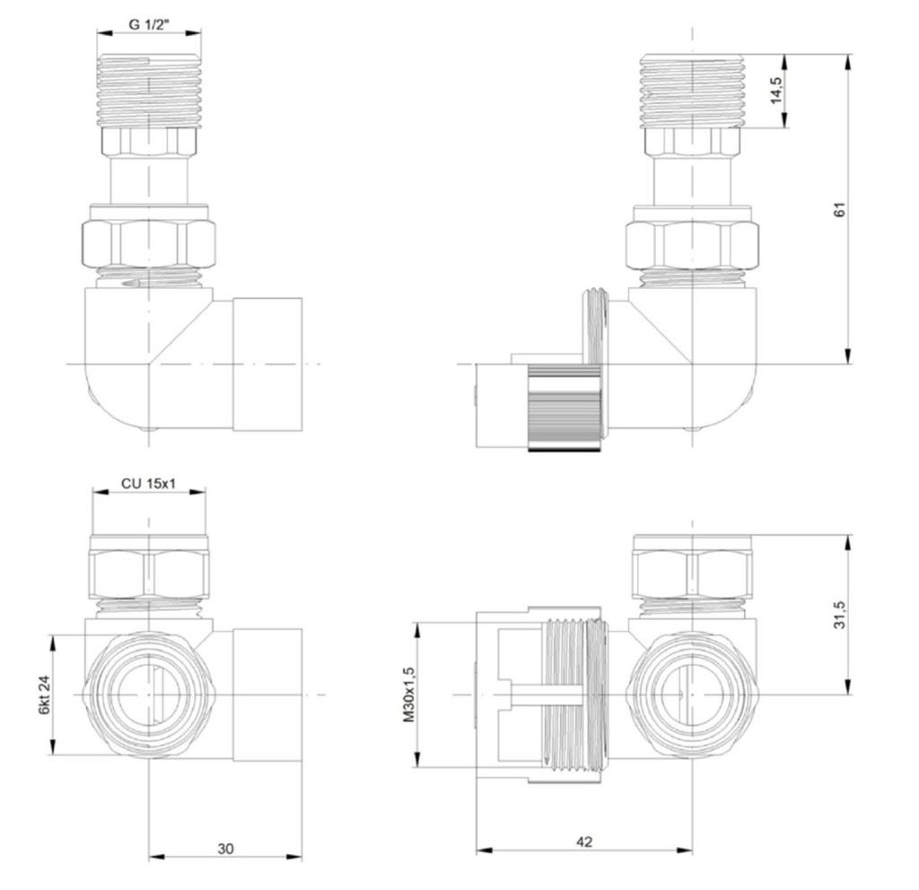 Rohová oboustranná (levá i pravá) termostatická sada PRIME vč. 2 krycích rozet a 2 krycích trubiček (plast) je určena pro připojení radiátorů na rozvody TUV s vývodem ze zdi s různou roztečí (krajní - rohové připojení). Nelze použít pro přímé napoje… (celý popis)