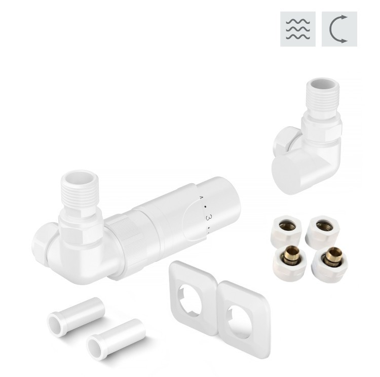 Rohová oboustranná (levá i pravá) termostatická sada PRIME vč. 2 krycích rozet a 2 krycích trubiček (plast) je určena pro připojení radiátorů na rozvody TUV s vývodem ze zdi s různou roztečí (krajní - rohové připojení).