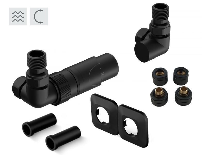 Rohová oboustranná (levá i pravá) termostatická sada PRIME vč. krycích rozet a 2 krycích trubiček (plast) je určena pro připojení radiátorů na rozvody TUV s vývodem ze zdi s různou roztečí (krajní - rohové připojení).