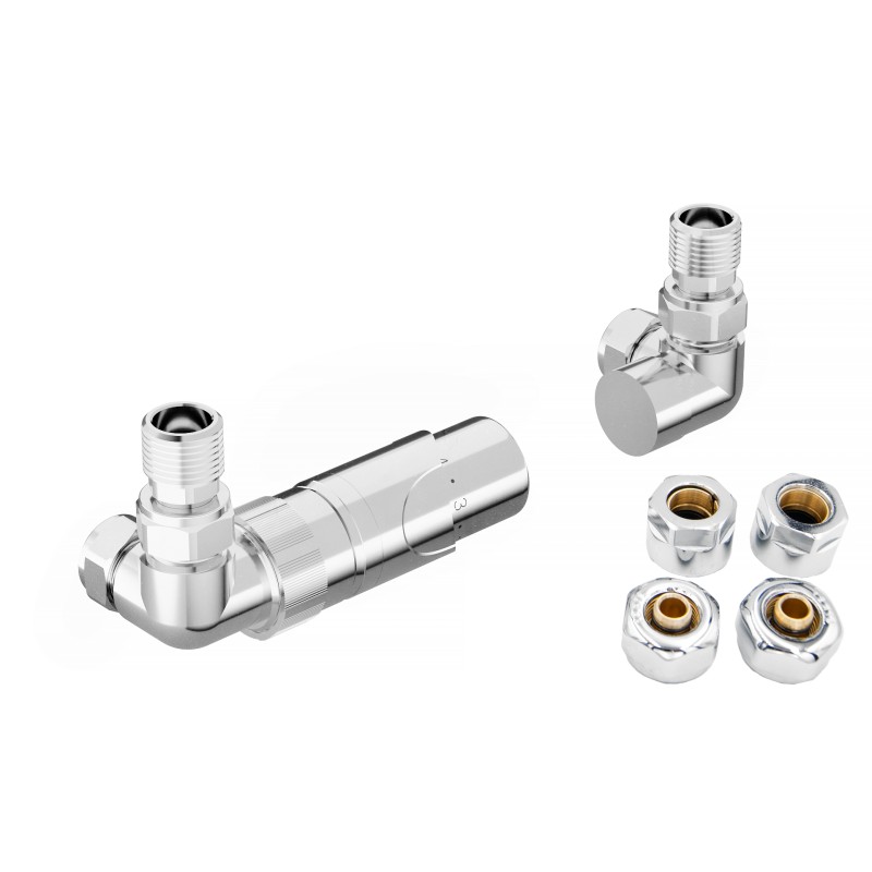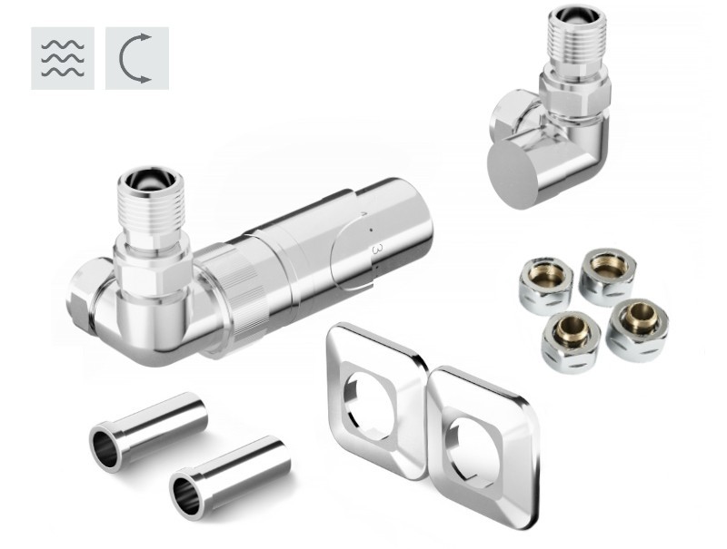 Rohová oboustranná (levá i pravá) termostatická sada PRIME vč. krycích rozet a 2 krycích trubiček (plast) je určena pro připojení radiátorů na rozvody TUV s vývodem ze zdi s různou roztečí (krajní - rohové připojení).