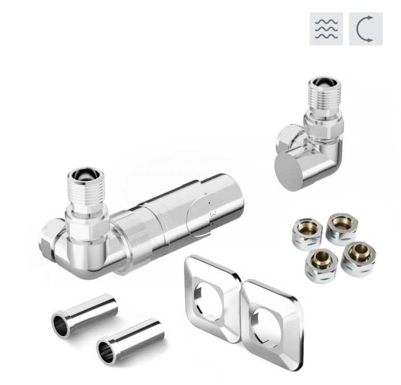 Rohová oboustranná (levá i pravá) termostatická sada PRIME vč. 2 krycích rozet a 2 krycích trubiček (plast) je určena pro připojení radiátorů na rozvody TUV s vývodem ze zdi s různou roztečí (krajní - rohové připojení).