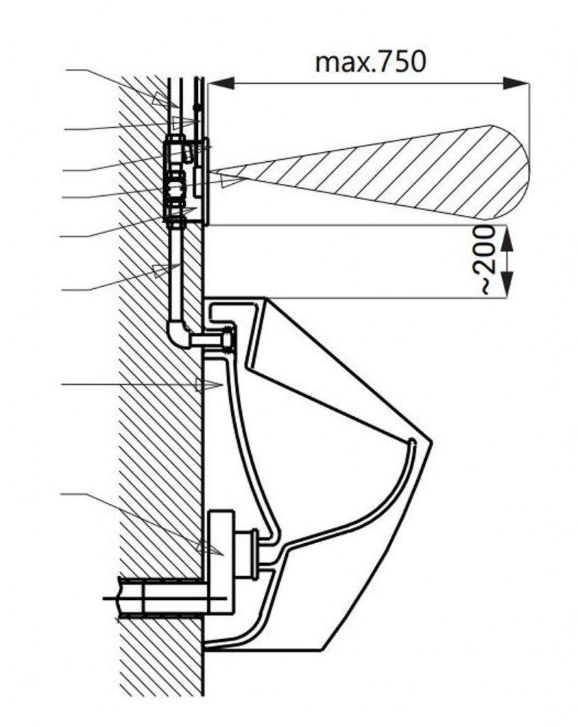 - reaguje na přítomnost osoby před pisoárem ve vzdálenosti max 0,7 m od snímače po dobu delší než 7,5 s