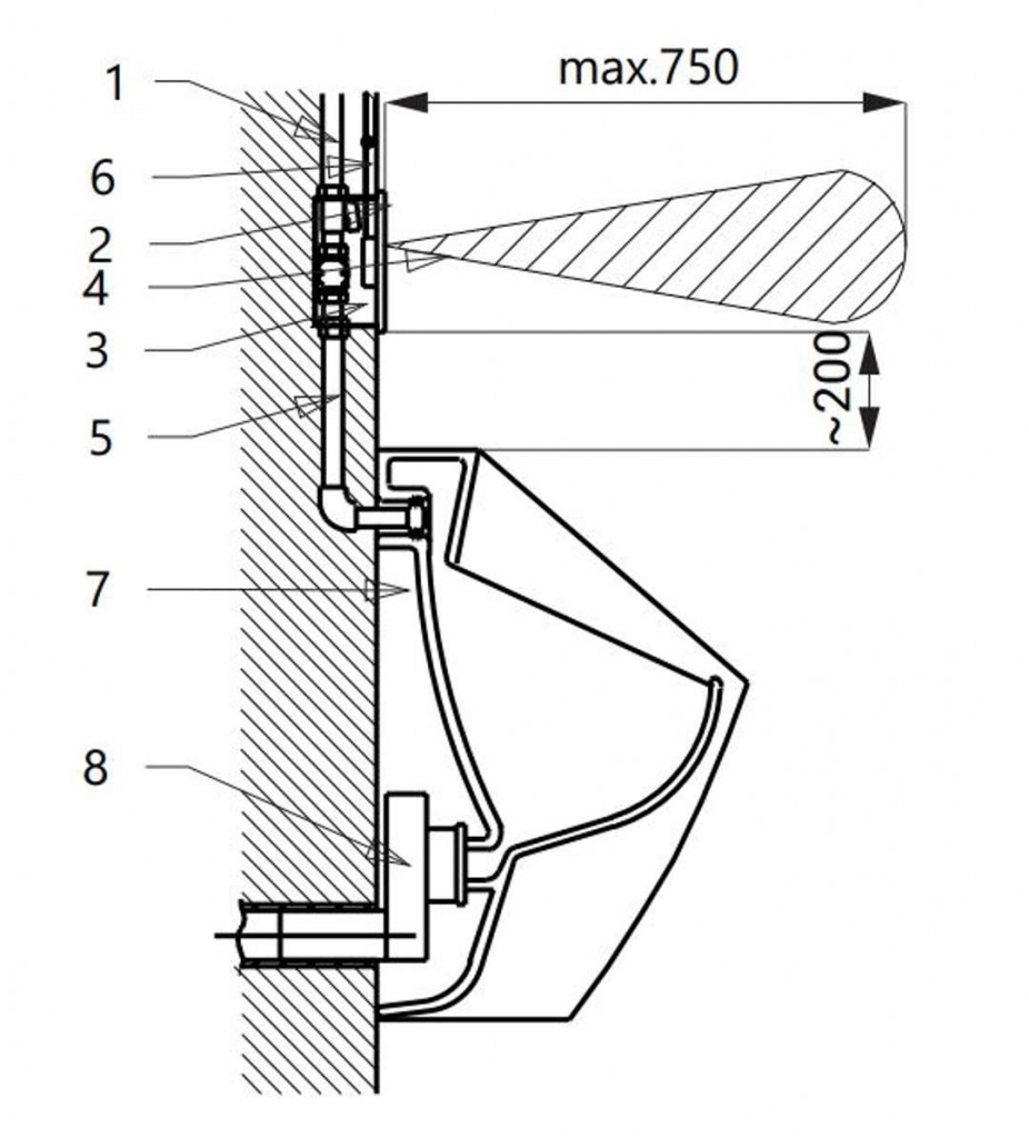 - reaguje na přítomnost osoby před pisoárem ve vzdálenosti max 0,7 m od snímače po dobu delší než 7,5 s