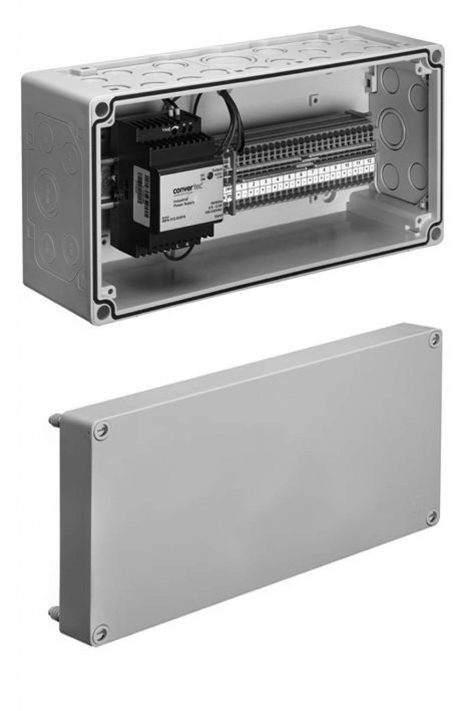- E-rozvodná skříň s SCHELL síťovým zdrojem pro 1-12 armatur, instalované na montážní liště včetně připojovací svorkovnice 12-krát
