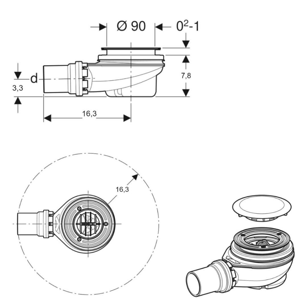 Sprchová odpadní souprava Geberit d90 s krytem odpadního ventilu, výška vodního uzávěru 50 mm, vývod z PE
