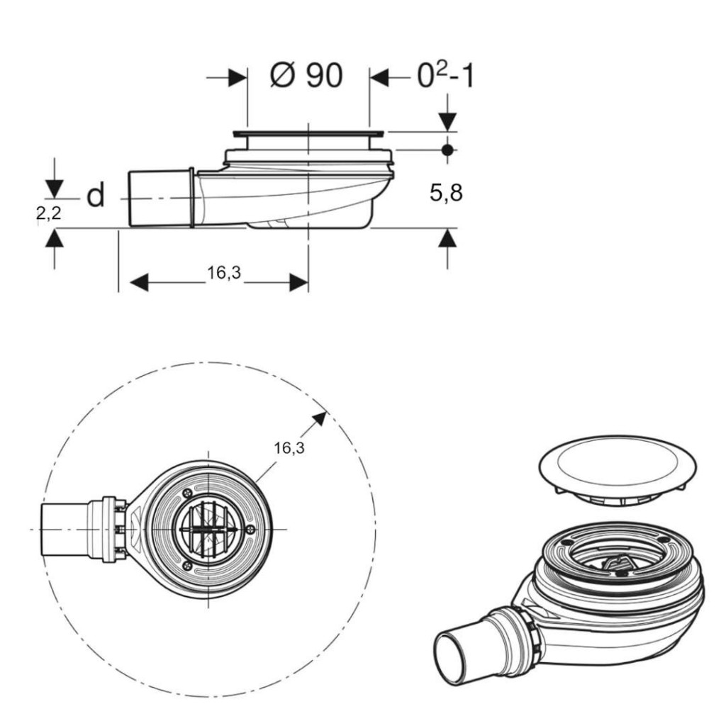 Sprchová odpadní souprava Geberit d90 s krytem odpadního ventilu, výška vodního uzávěru 30 mm, vývod z PE
