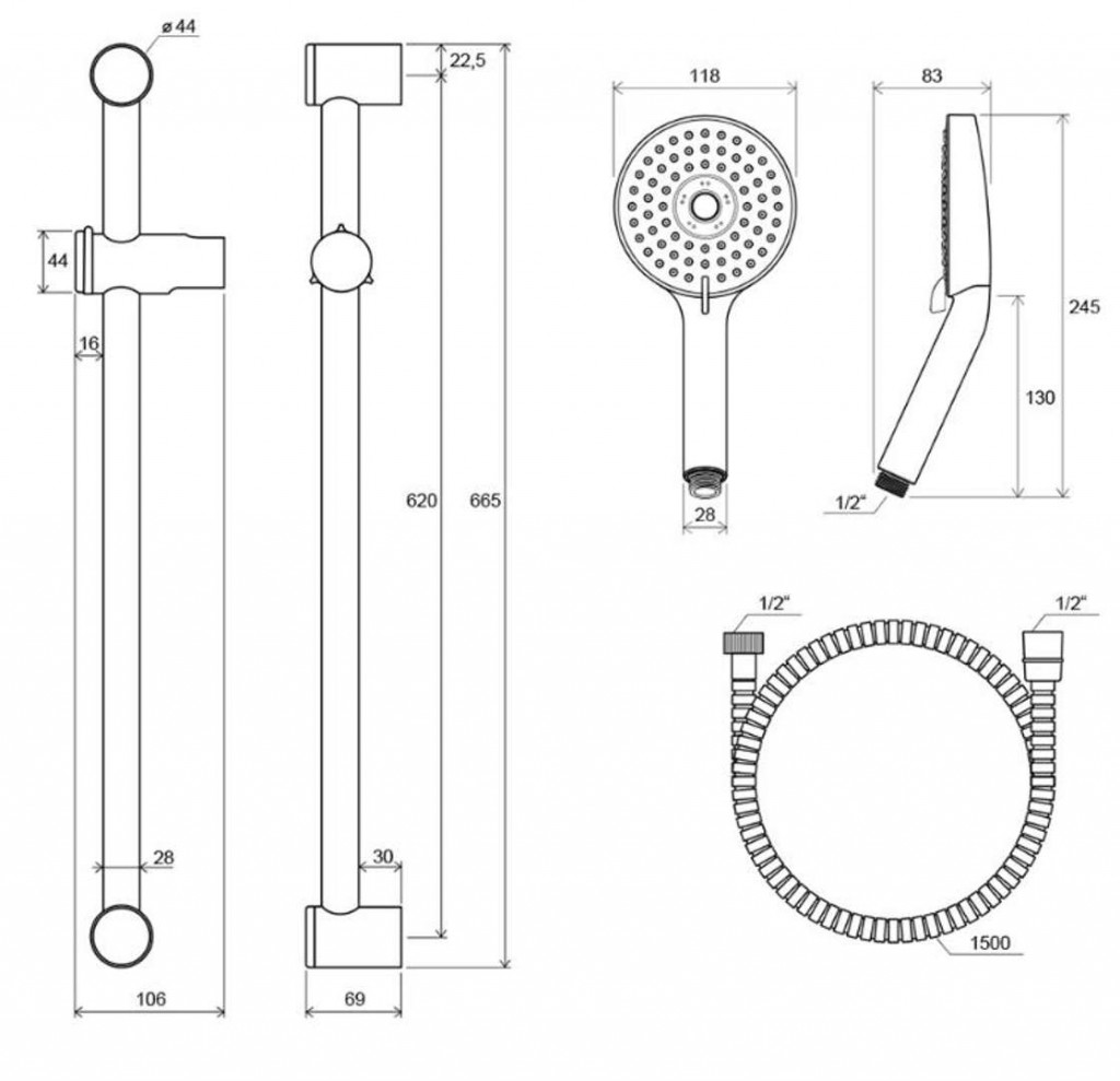 - sprchová tyč: 600 mm, s posuvným držákem sprchy