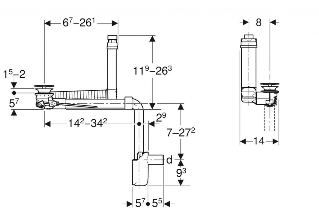 Odtok umyvadla Geberit Clou, prostorově úsporný, úzké provedení, s pákovým ovládáním a krytem odtoku d=40mm