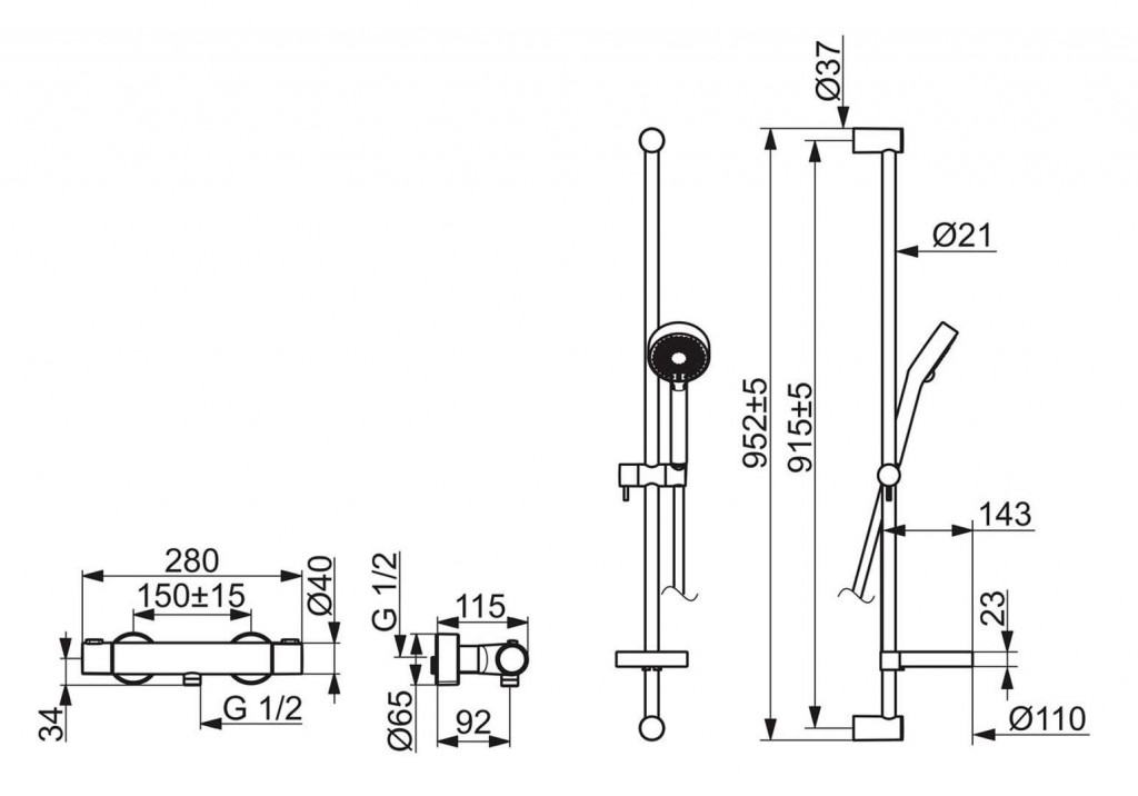 • nástěnná tyč, délka: 900 mm, Ø 21 mm (aretovatelné výškové nastavení)