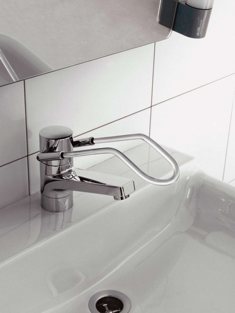 Umyvadlo s integrovaným madlem, vhodné pro osoby s tělesným postižením.