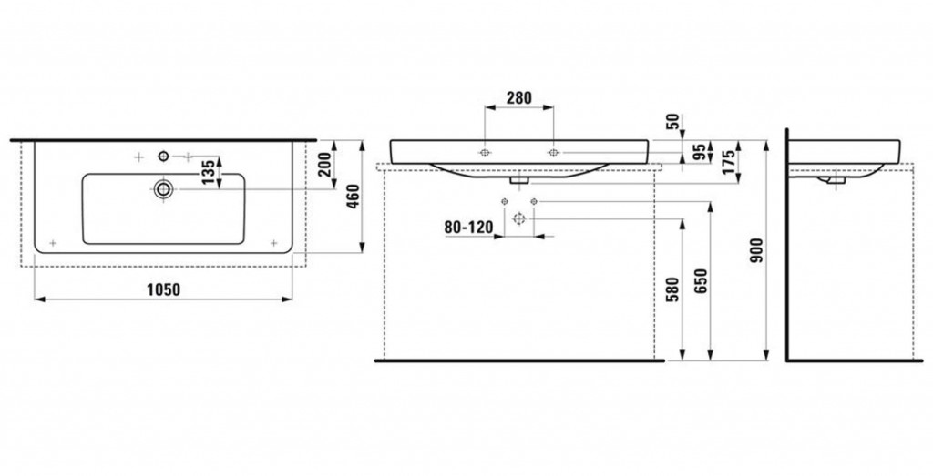 Umyvadlo se třemi otvory pro baterii, s přepadem.
