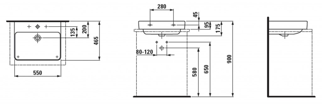 Umyvadlo se třemi otvory pro baterii, s přepadem.