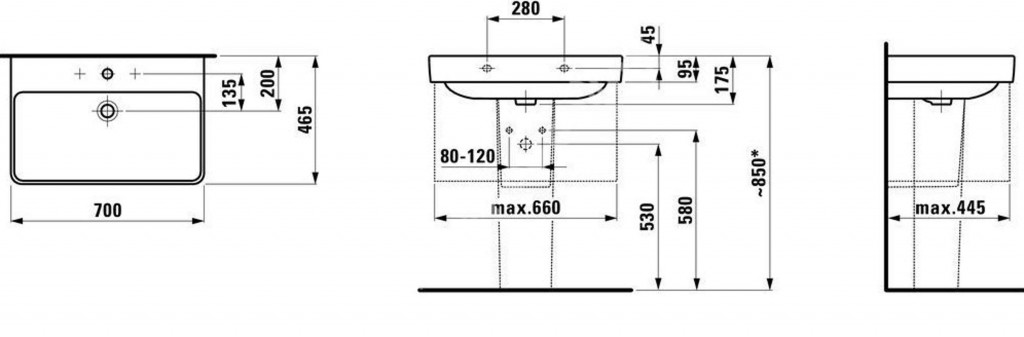 Umyvadlo se třemi otvory pro baterii, s přepadem.