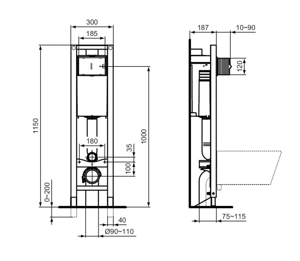 - výška: 1150 mm, hloubka: 197 mm, minimální instalační hloubka: 187 mm