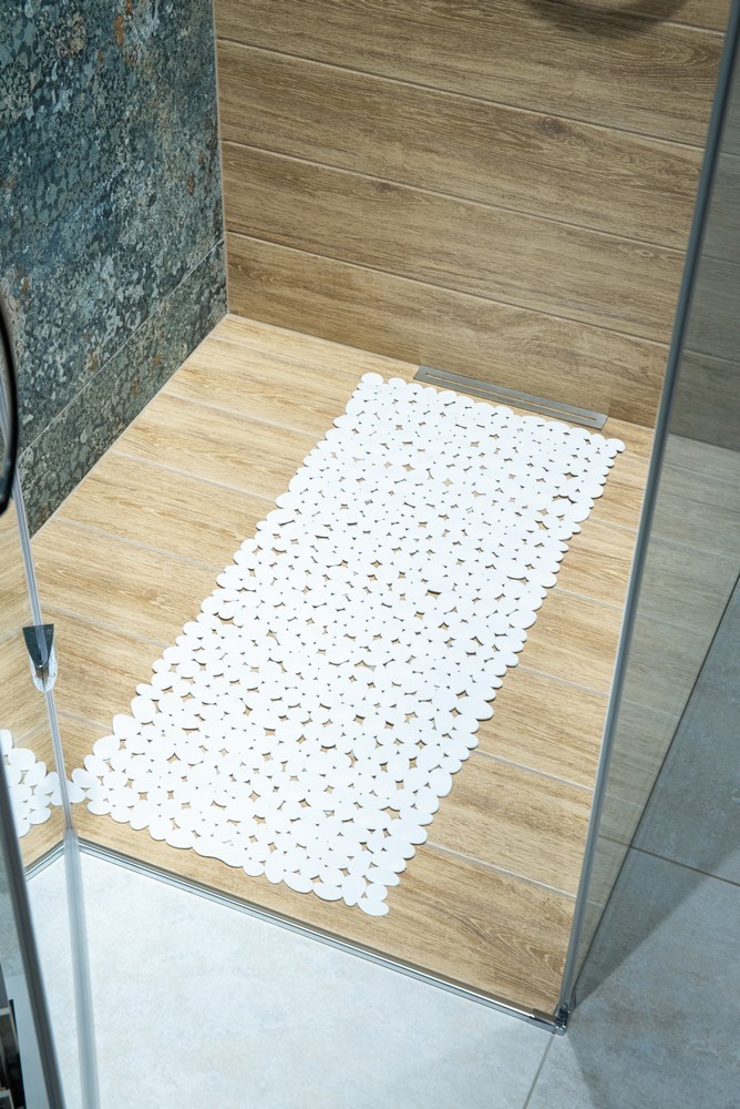 Obdélníková, bílá koupelnová předložka s oblázkovým motivem. Má protiskluzové přísavky pro zajištění bezpečnosti v koupelně. Čistit na 30 stupňů, nežehlit, chemicky nečistit, nebělit, nesušit v sušičce.