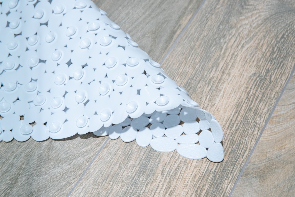 Čtvercová, bílá koupelnová předložka s motivem oblázků. Má protiskluzové přísavky pro zajištění bezpečnosti v koupelně. Čtvercová koupelnová předložka se doporučuje pro sprchové vaničky. Čistit na 30 stupňů, nežehlit, chemicky nečistit, nebělit, nesušit v sušičce.