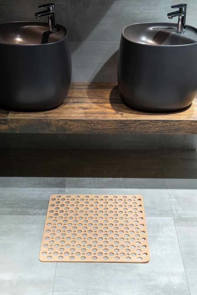 Čtvercová, protiskluzová koupelnová předložka v béžové barvě. Má speciální přísavky, které zabraňují jeho klouzání po povrchu. Tento model koupelnové předložky vyniká od ostatních tradičních předložek svou výškou a speciálním designem, díky čemuž je velmi příjemný na používání. Čtvercový tvar dokonale zapadne do sprchové vaničky. Koupelnová předložka se velmi snadno čistí. Čistit na 30 stupňů, nežehlit, chemicky nečistit, nebělit, nesušit v sušičce.