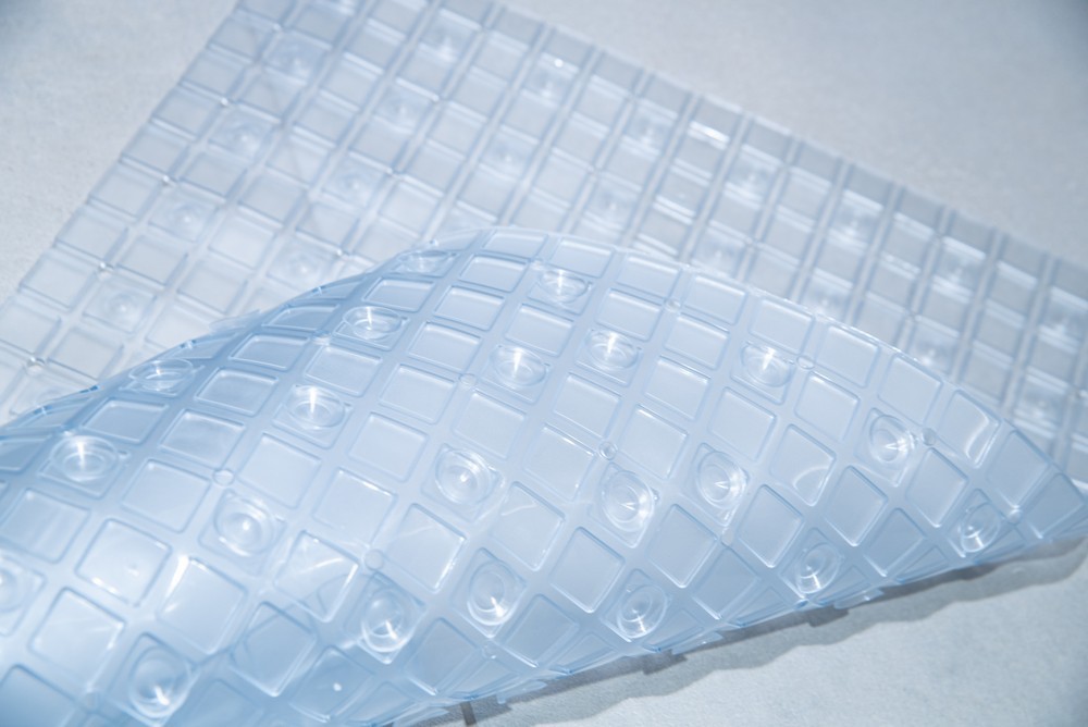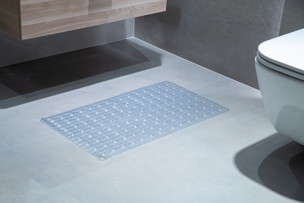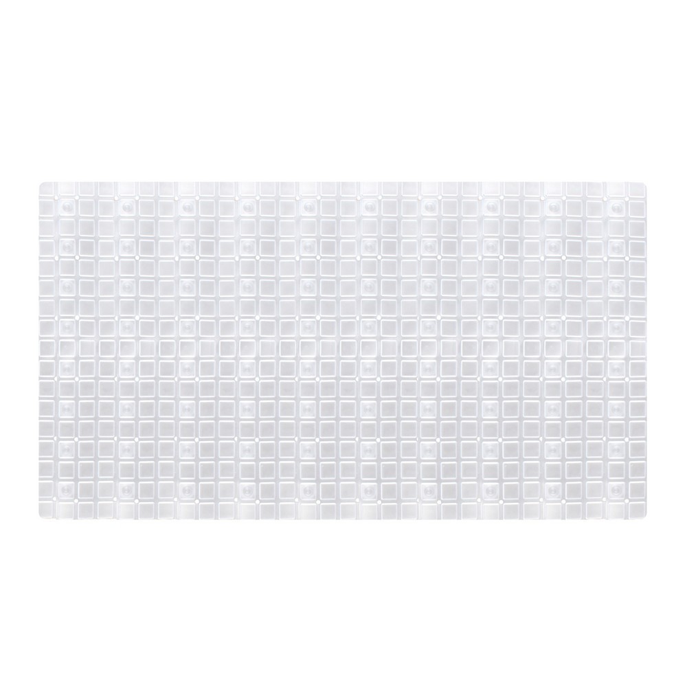Průhledná koupelnová předložka z odolného PVC obdélníkového tvaru. Skvěle poslouží ve vaně nebo dlouhé sprchové vaničce. Protiskluzová podložka má speciální přísavky, které zabraňují jejímu pohybu. Čistit na 30 stupňů, nežehlit, chemicky nečistit, nebělit, nesušit v sušičce.