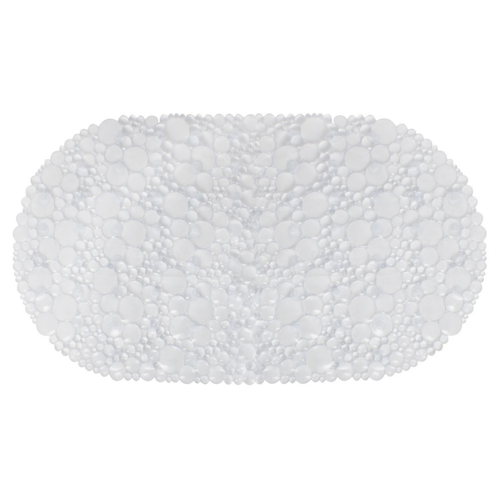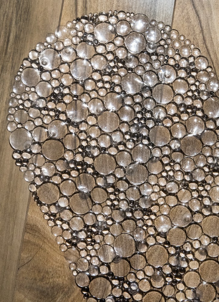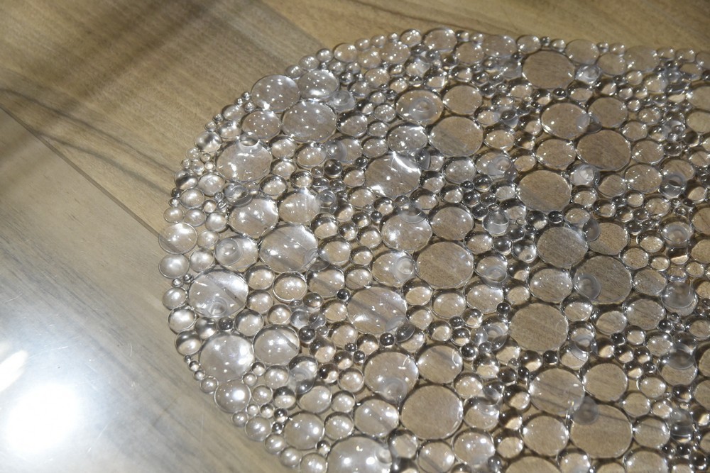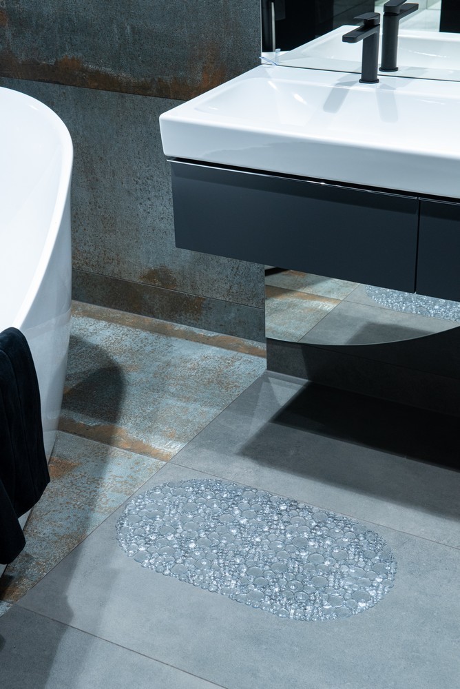Koupelnová předložka inspirovaná kapkami vody, lesklá a krásná. Protiskluzová podložka je vybavena speciálními přísavkami, které ji přichytí k zemi. Dobře poslouží jako podložka do vany nebo velké sprchové vaničky. Čistit na 30 stupňů, nežehlit, chemicky nečistit, nebělit, nesušit v sušičce.