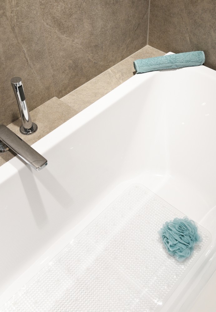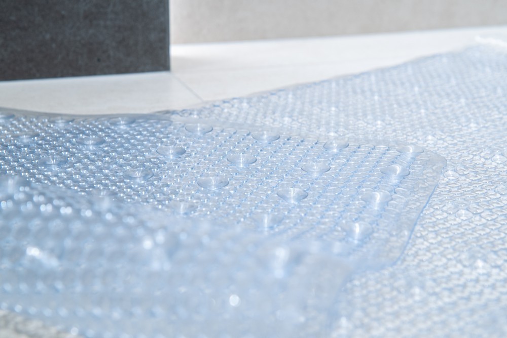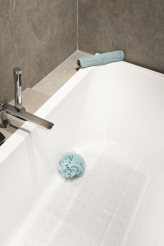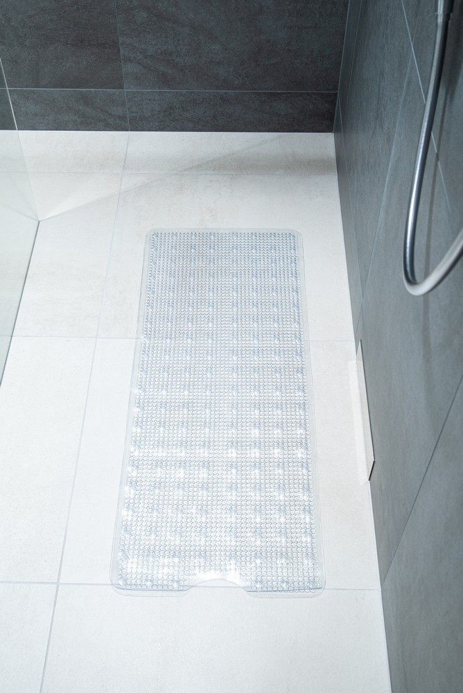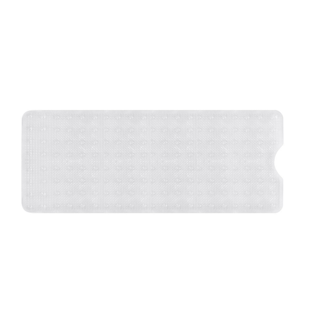 Dlouhá koupelnová předložka z průhledného PVC. Pro bezpečnost má protiskluzové přísavky. Podložka je ideální pro dlouhou vanu, jedna strana podložky má speciální výřez pro odtok. Čistit na 30 stupňů, nežehlit, chemicky nečistit, nebělit, nesušit v sušičce.
