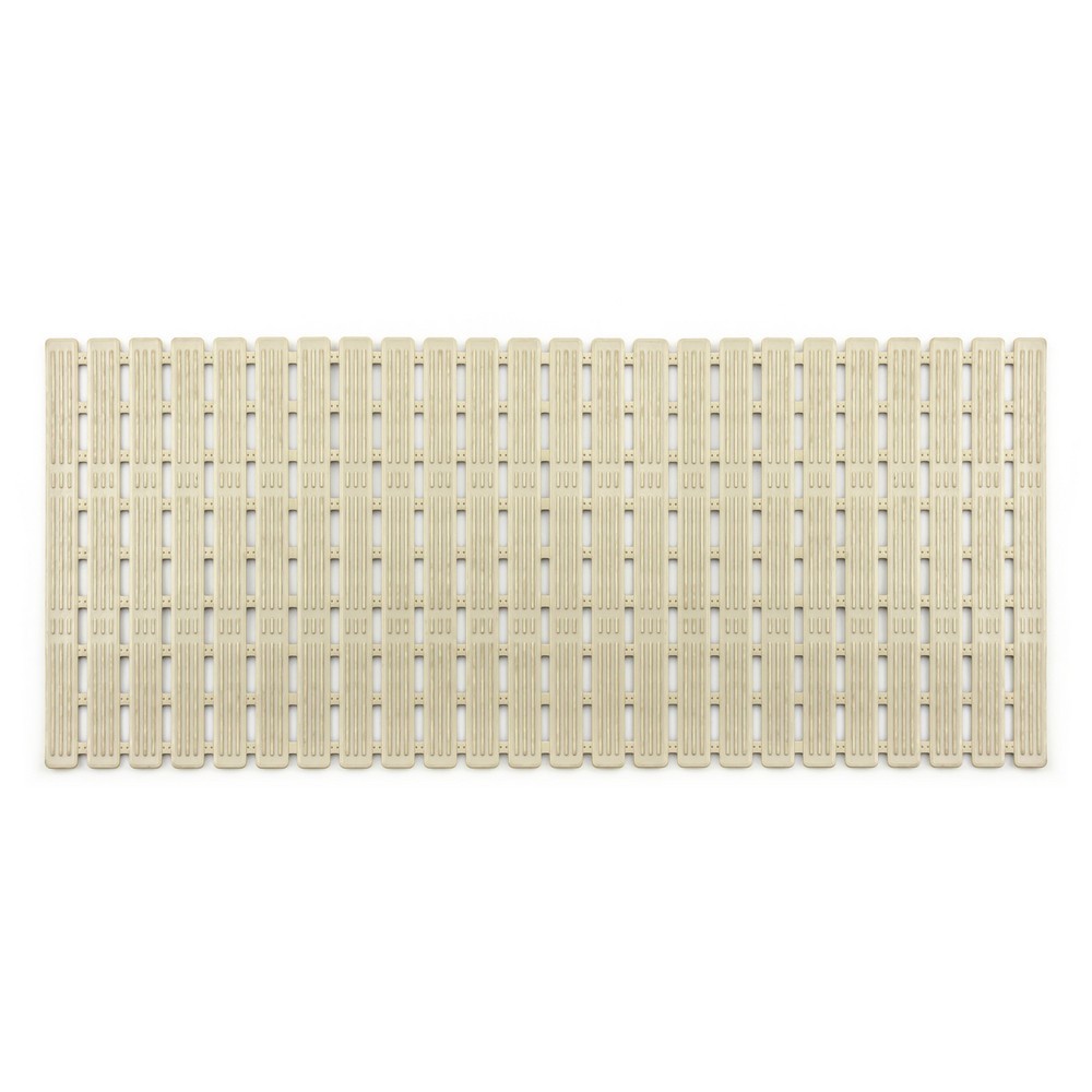 Protiskluzová podložka podlouhlého tvaru vyrobená z kombinace dvou funkčních materiálů: PP a TPE. Skládá se z pevných lamel v elegantní béžové barvě a je tak ideálním doplňkem do moderních interiérů. Podložka perfektně funguje na rovném povrchu a poskytuje ochranu podlahy při vystupování z vany nebo sprchy. Vybavena přísavkami, které jej bezpečně přichytí k podlaze, zaručuje stabilitu a bezpečnost uživatele. Koupelnová předložka měří 91 cm na délku a 40 cm na šířku. Prát na 30 stupňů, nežehlit, chemicky nečistit, nebělit, nesušit v sušičce.