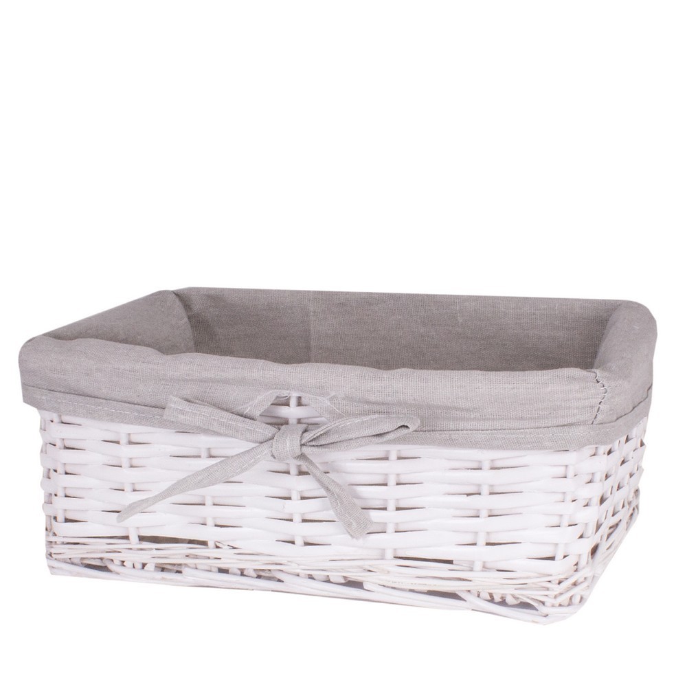 Proutěný koš na středně velké předměty. Vnitřek je podšitý bavlněným plátnem. Vpředu má ozdobnou kravatu v podobě mašle, která mu dodává kouzlo.