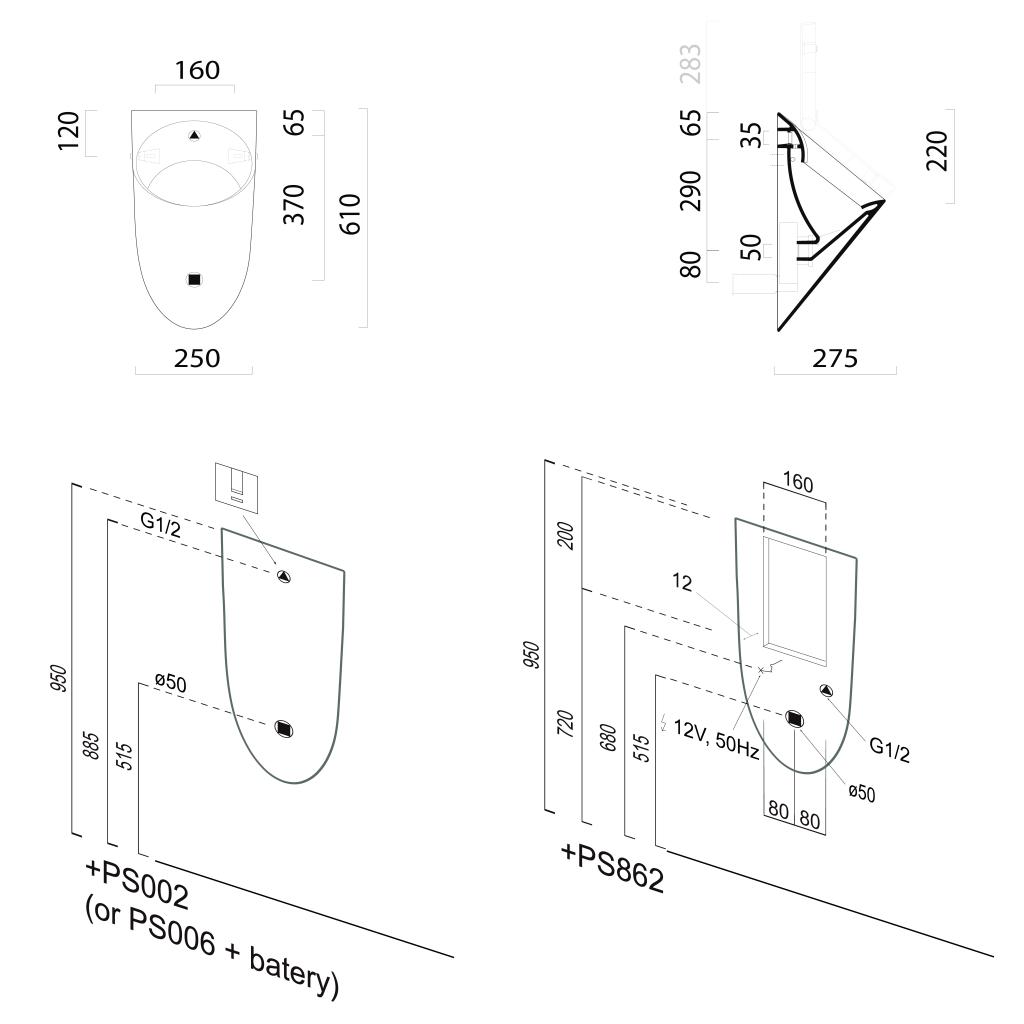 - Při instalaci s automatickým splachovačem PS002 je nutné instalovat i napájecí zdroj (PS05T nebo PS10T).