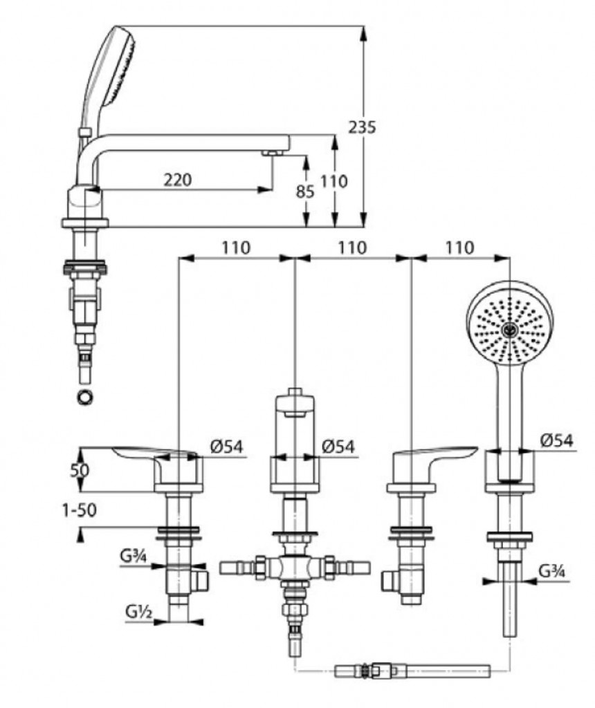 Vanová čtyřotvorová baterie pro montáž na okraj vany