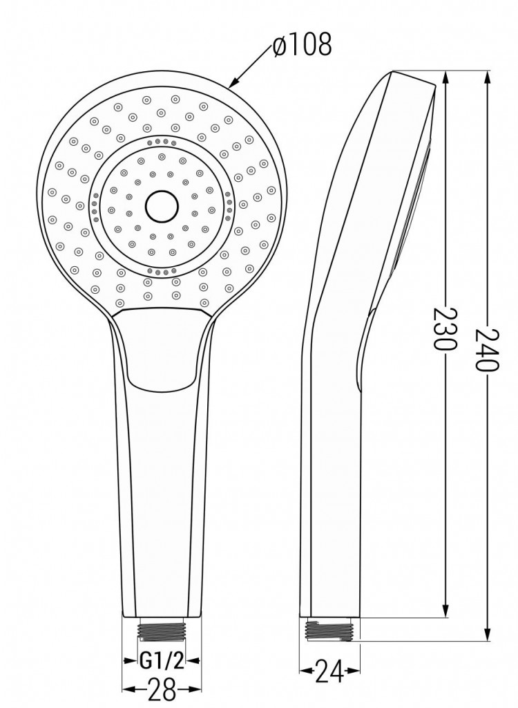 Plastová ruční sprcha od výrobce MEXEN se třemi funkcemi, která lze ovládat jen pomocí jednoho tlačítka SELECT a standardním připojením G 1/2". Rozměry: výška: 230 mm, průměr hlavy: 108 mm. Opatřená je povrchovou úpravou v různých barevných variantách. Gumové trysky, kterými je ruční sprcha opatřena, zabraňují usazování vodního kamene.