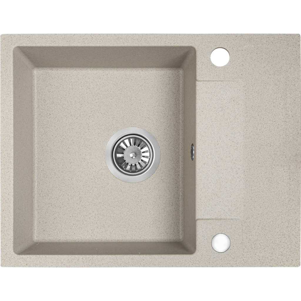 RAB – Béžový jednodřezový žulový dřez s polovičním odtokem. Jednodřezy s polovičním odtokem jsou určeny do středně velkých a malých kuchyní nebo kuchyňských koutů. Hodí se také jako další dřez ve větší kuchyni se dvěma umyvadly. Béžový jednodřezový žulový dřez s polovičním odtokem ze série RAB je velmi elegantní produkt s decentním designem. Velkoryse dimenzovaná mísa o hloubce 16 cm zajišťuje pohodlné mytí nádobí a přípravu jídel. Zároveň výrazně nesnižuje prostor pod dřezem. Produkt je také vybaven samostatným kompaktním sifonem, který vede odtokovou trubku až ke zdi. To umožňuje instalaci až dvou zásuvek pod dřez – jedné mělké pro užitečné příslušenství a druhé hluboké, vybavené systémem třídění odpadu. Parametry zapuštěného dřezu RAB s polovičním odtokem: Jednodřezový dřez RAB s polovičním odtokem je klasický obdélníkový dřez. Jeho celkové rozměry jsou 560 mm x 440 mm x 175 mm. Většinu tohoto prostoru zabírá velká mísa o šířce 34 cm a malý odkapávač se zajímavým reliéfním vzorem. Dřez RAB má otvor pro baterii a je oboustranný. To umožňuje jeho instalaci s odkapávačem vpravo nebo vlevo, čímž se dokonale integruje do kuchyňského uspořádání. Tento dřez je zabudován do pracovní desky. Součástí dodávky je montážní šablona, která zjednodušuje vyřezání příslušného otvoru. Součástí dodávky jsou montážní klipy zajišťující bezpečnou instalaci. Rozměry dřezu umožňují instalaci na kuchyňskou skříňku o šířce 50 cm. Součástí dodávky je sifon s připojením na myčku nádobí. Dřez je vybaven funkční manuální zátkou odpadu. Moderní jednodřezový dřez RAB s poloviční odtokovou nádrží. Žulové dřezy nabízejí odolnost a skvělý vzhled po mnoho let používání. Jsou vyrobeny z kompozitu přírodních žulových agregátů s přídavkem vysoce kvalitních pryskyřic. Díky tomu jsou dřezy nejen odolné proti poškrábání a skvrnám, ale také velmi trvanlivé. Žulové dřezy se také velmi snadno čistí díky svému dokonale hladkému povrchu. Béžová barva dřezu RAB se hodí k mnoha interiérovým stylům. Hodí se jak do klasických, elegantních kuchyní, tak i do kuchyní zařízených v moderním stylu. Tento model je k dispozici i v dalších barvách – černé a šedé.