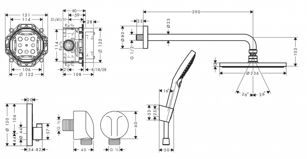 - sprchové rameno 390 mm, nástěnná instalace, úhel 90°