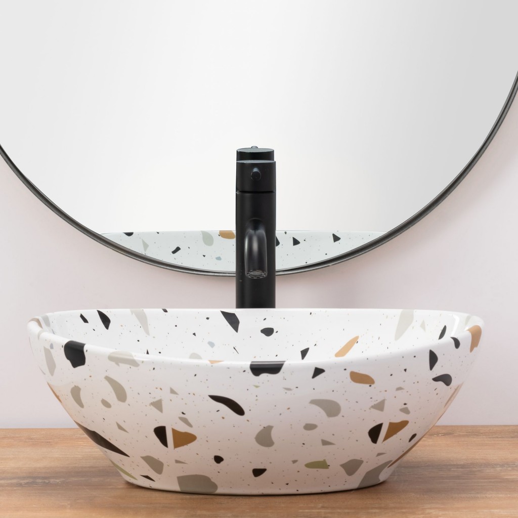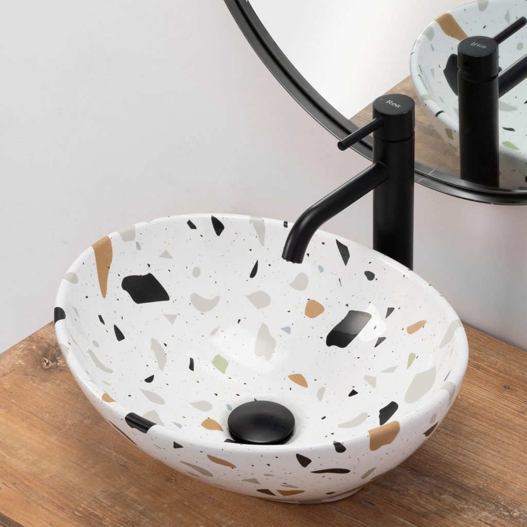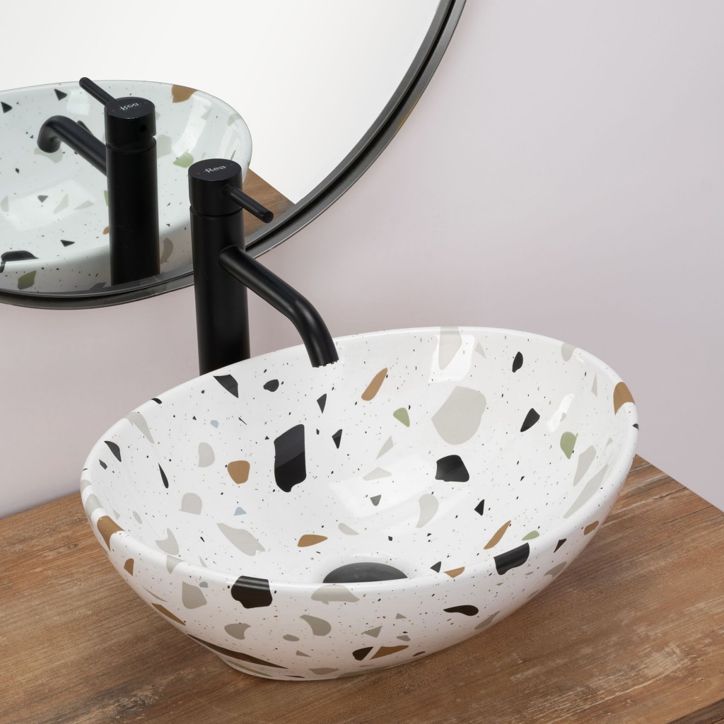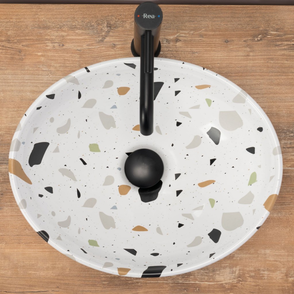 Umyvadlo na desku Rea Sofia Terazzo je vyrobené z vysoce kvalitních materiálů, splní požadavky lidí, kteří si cení kvality a stylu. Díky harmonickým liniím se perfektně hodí k jakémukoli stylu. A aerodynamický tvar mu dodává lehkost. Moderní tvar a bezchybně hladká keramika jsou zárukou kvality.