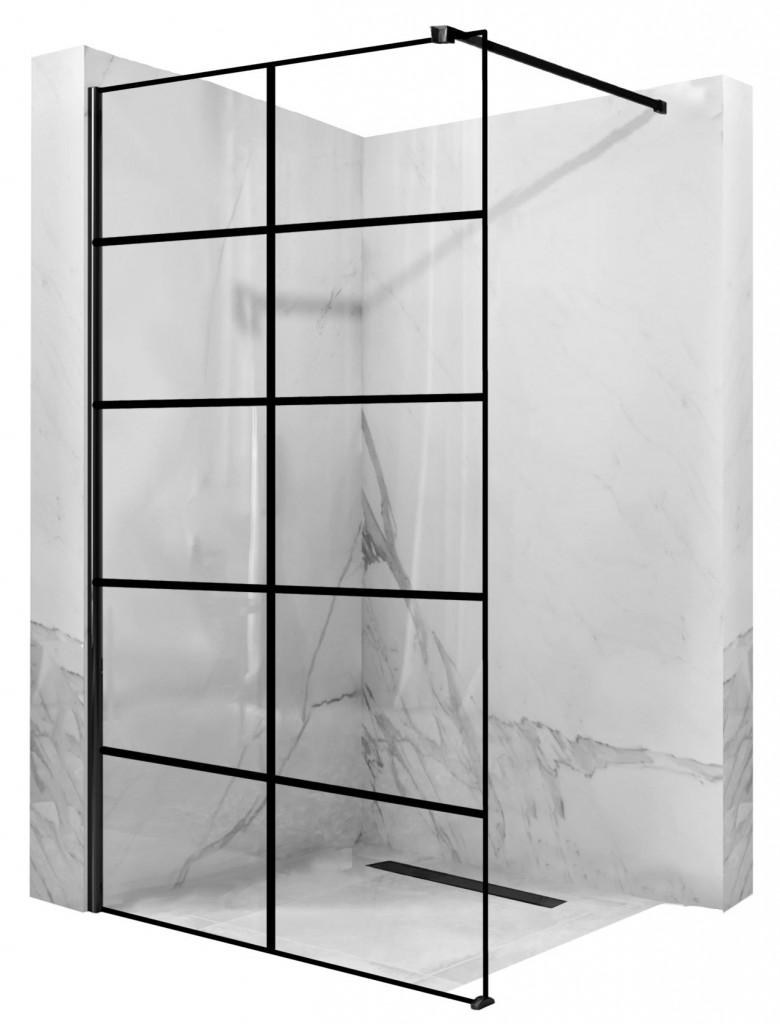 Zástěna je vyrobena z kvalitního černého hliníku (stěnový profil + spodní podlahová lišta). Směr instalace je univerzální a stěnový profil díky svému přizpůsobení eliminuje jakékoli zakřivení stěn. Navíc připojená soklová lišta chrání sprchové sklo před poškozením. Tvrzené průhledné sklo je pokryto speciální vrstvou EASY CLEAN, která usnadňuje čištění. I přesto je dobré na transparentní sklo používat stěrku. Síla skla je o tloušťce 8 mm, díky čemuž je stěna stabilní a snadno se instaluje, a dodatečná stabilizační vzpěra, která je součástí, činí sprchovou stěnu velmi pevnou.