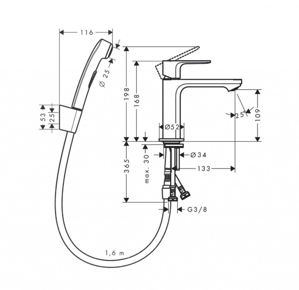 Páková umyvadlová baterie s ruční sprchou Bidette a sprchovou hadicí