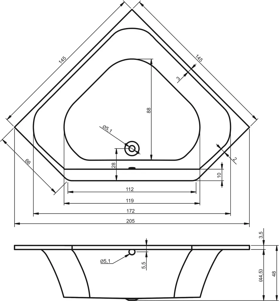 Riho vana AUSTIN bílá 1450 x 1450 mm typ BA11 bez noh (celý popis)