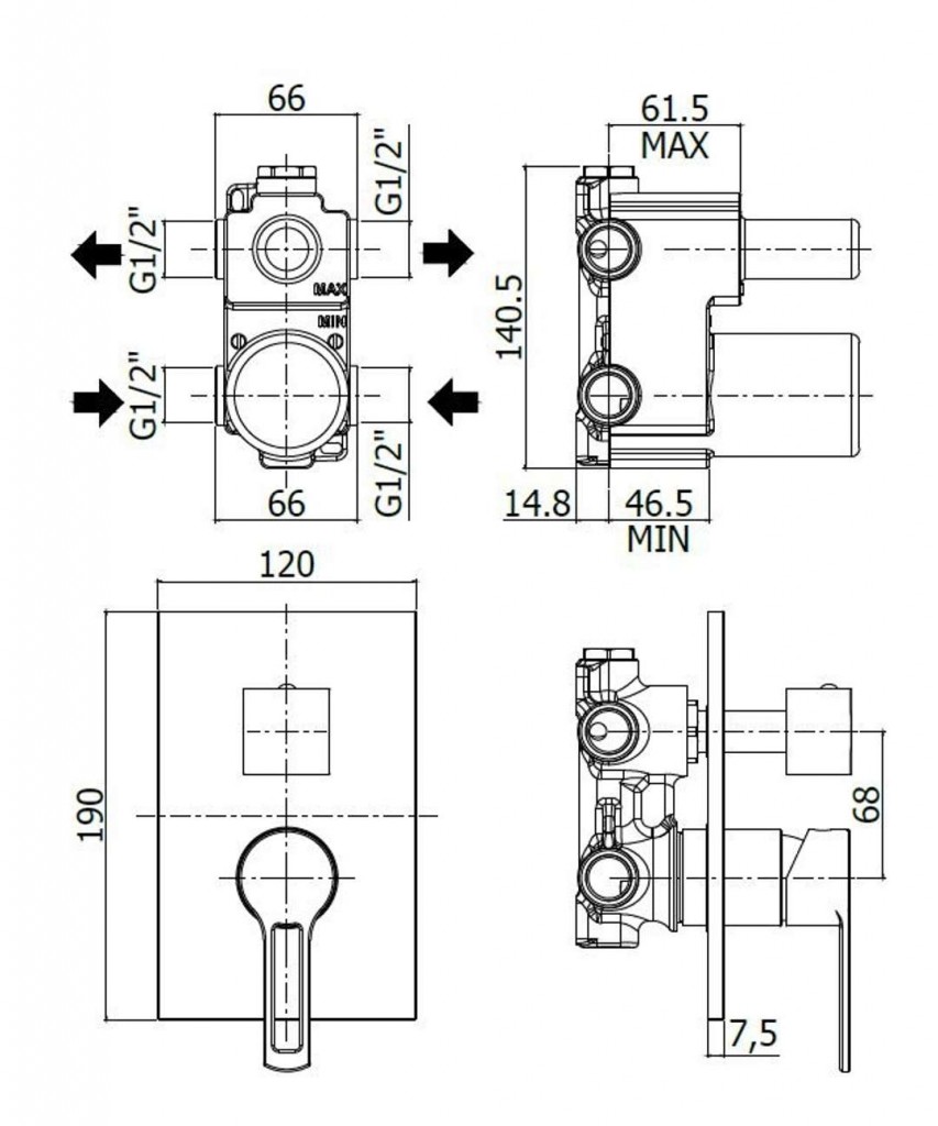 Sprchová páková baterie s otočným přepínačem včetně podomítkového tělesa pro 2 vývody