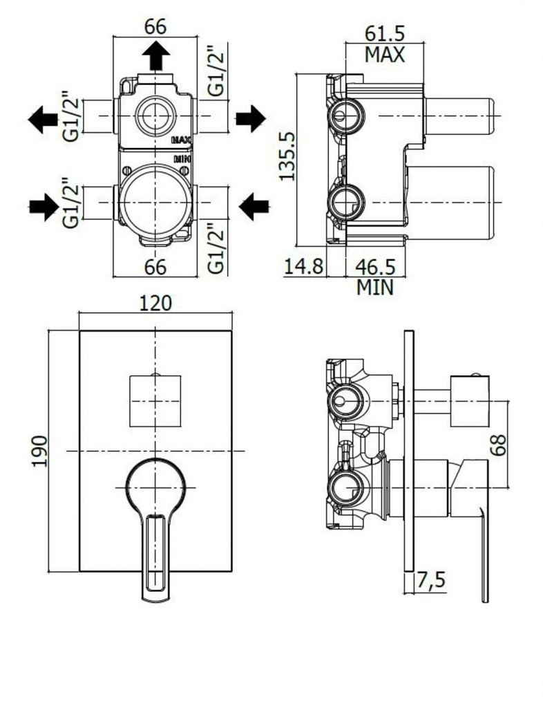 Sprchová páková baterie s otočným přepínačem včetně podomítkového tělesa pro 3 vývody