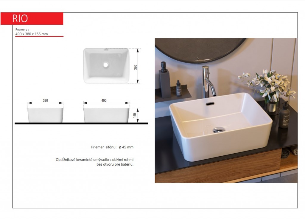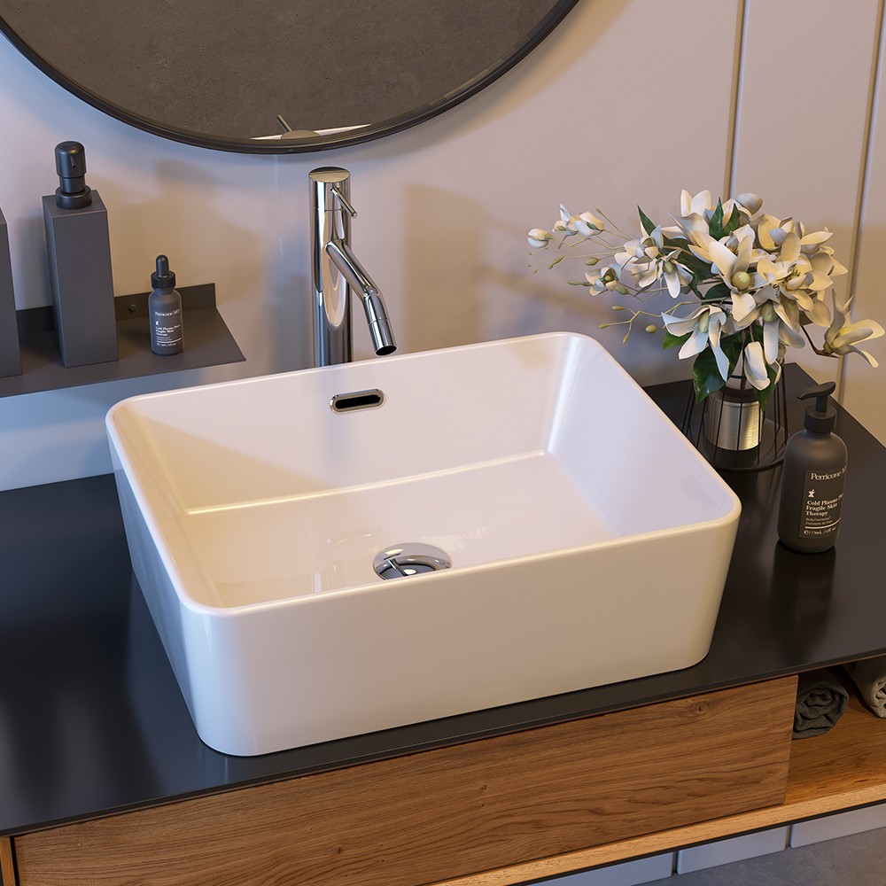 Obdélníkové keramické umyvadlo bez otvoru pro baterii, s přepadem