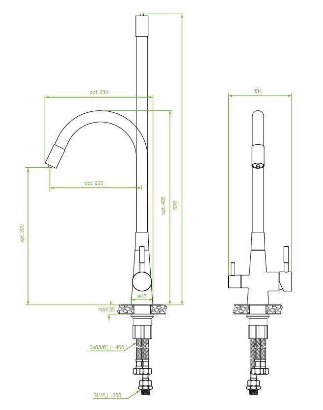 - dosah výtoku: volitelně až 360 mm