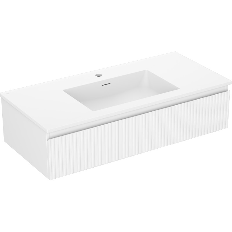 Specifikace produktu: Rozměry skříňky: Šířka: 100 cm Hloubka: 46 cm Výška: 23,5 cm Barva korpusu: Matná bílá Materiál korpusu: Lakovaná deska Barva čela: Matná bílá Materiál čela: Lakovaná MDF deska Struktura čela: Drážkovaná Počet zásuvek: 1 Prostorná zásuvka s funkcí tichého dovírání Povrch odolný vůči UV záření Rozměry umyvadla: Šířka: 101 cm Hloubka: 46,5 cm Výška: 16,5 cm Barva umyvadla: Matná bílá Materiál umyvadla: Konglomerát Otvor pro přepad: Ano Otvor pro baterii: Ano Smontovaný výrobek