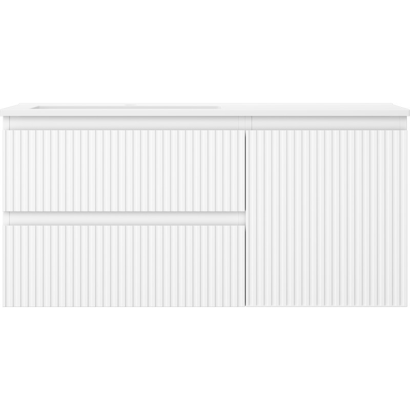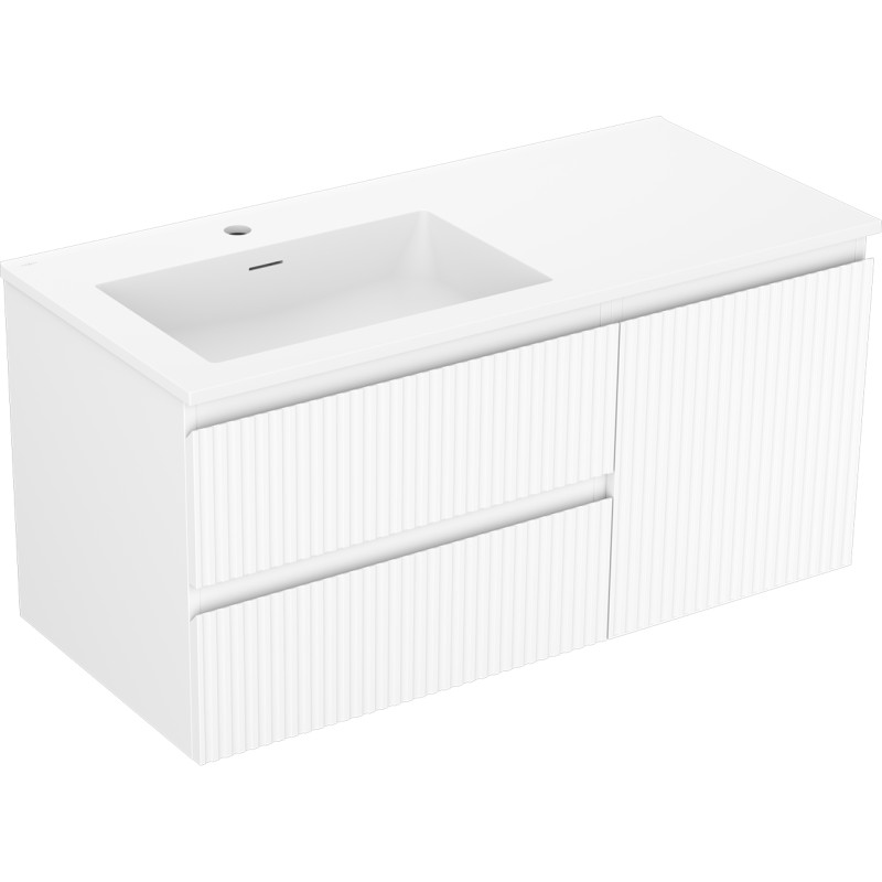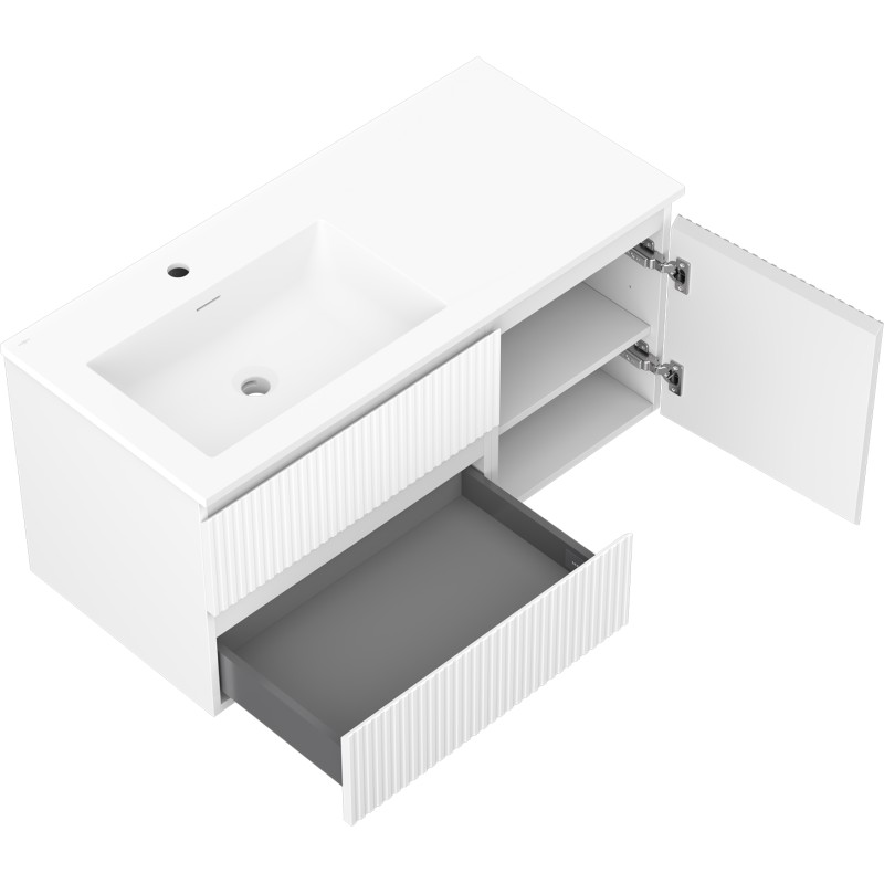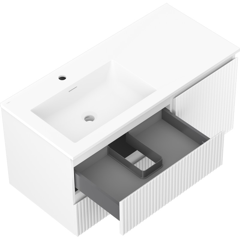 Specifikace produktu: Rozměry skříňky: Šířka: 100 cm Hloubka: 46 cm Výška: 47 cm Sada obsahuje: Zásuvková skříňka pod umyvadlo: Šířka: 60 cm Hloubka: 46 cm Výška: 47 cm Barva korpusu: Matná bílá Materiál korpusu: Lakovaná deska Barva čela: Matná bílá Materiál čela: Lakovaná MDF deska Konstrukce čela: Drážkovaná Počet zásuvek: 2 Prostorná zásuvka s funkcí tlumeného dovírání Umyvadlová skříňka s dvířky: Šířka: 40 cm Výška: 47 cm Hloubka: 46 cm Barva korpusu: Matná bílá Materiál korpusu: Lakovaná deska Barva čela: Matná bílá Materiál čela: Lakovaná MDF deska Konstrukce čela: Drážkovaná Počet dvířek: 1 1 police Panty s funkcí tlumeného dovírání Univerzální montáž dvířek (levé/pravé) Povrch odolný vůči UV záření Umyvadlo: Šířka: 101 cm Hloubka: 46,5 cm Výška: 16,5 cm Barva umyvadla: Matná bílá Materiál umyvadla: Konglomerát Otvor pro přepad: Ano Otvor pro baterii: Ano Výrobek smontovaný