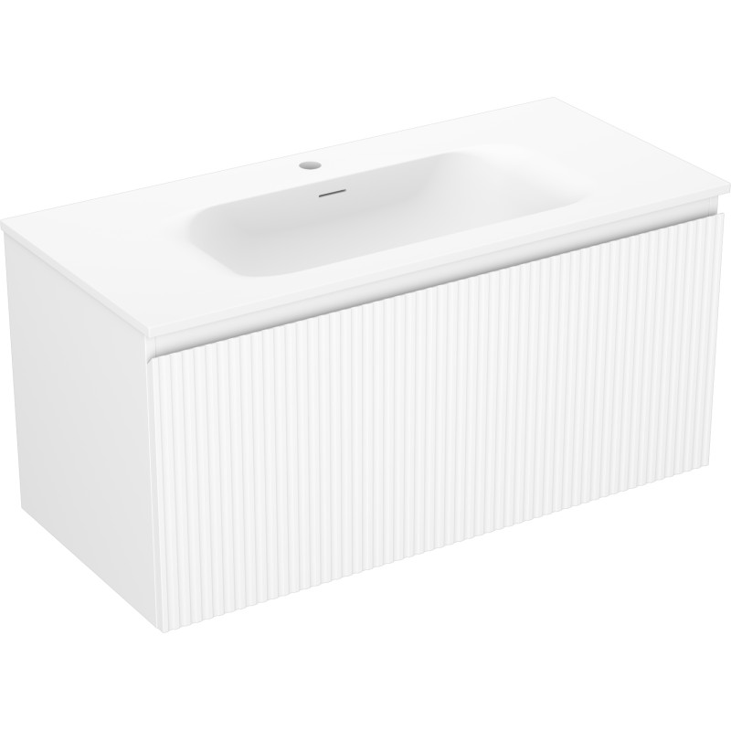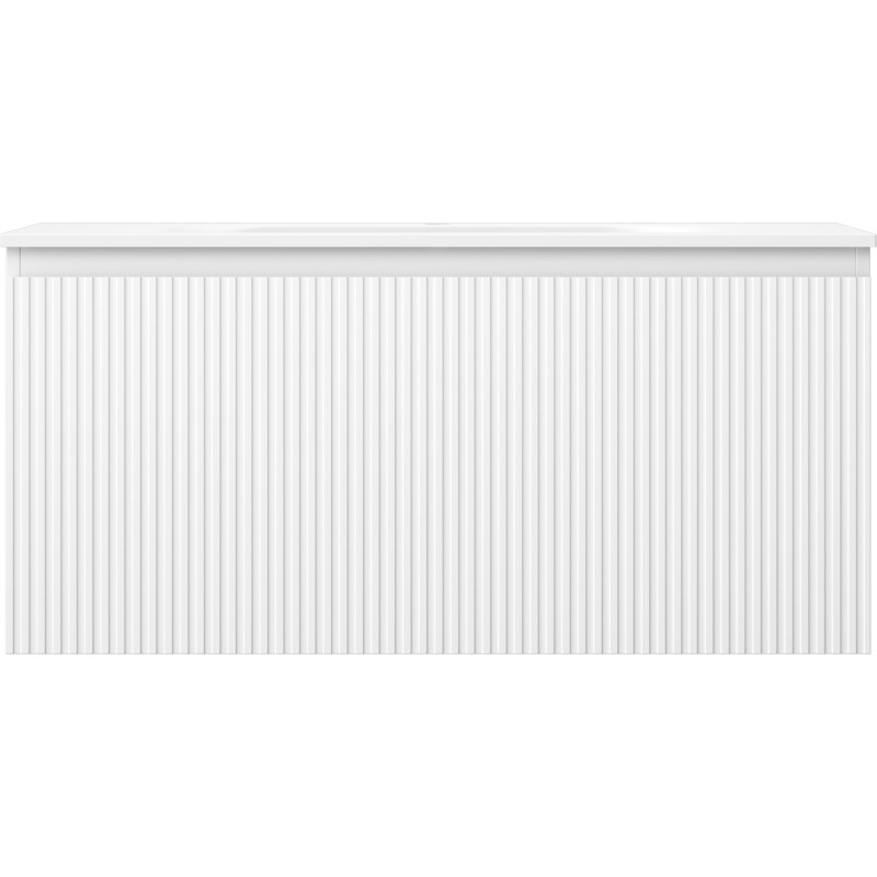 Specifikace produktu: Rozměry skříňky: Šířka: 100 cm Hloubka: 46 cm Výška: 47 cm Barva korpusu: Matná bílá Materiál korpusu: Lakovaná deska Barva čela: Matná bílá Materiál čela: Lakovaná MDF deska Struktura čela: Drážkovaná Počet zásuvek: 1 Prostorná zásuvka s funkcí tichého dovírání Povrch odolný vůči UV záření Rozměry umyvadla: Šířka: 101 cm Hloubka: 46,5 cm Výška: 16,5 cm Barva umyvadla: Matná bílá Materiál umyvadla: Konglomerát Otvor pro přepad: Ano Otvor pro baterii: Ano Smontovaný výrobek