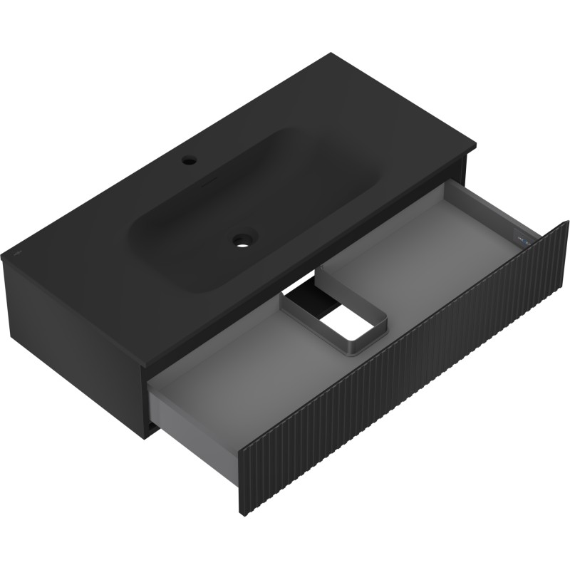 Specifikace produktu: Rozměry skříňky: Šířka: 100 cm Hloubka: 46 cm Výška: 23,5 cm Barva korpusu: Matná černá Materiál korpusu: Lakovaná deska Barva čela: Matná černá Materiál čela: Lakovaná MDF deska Struktura čela: Drážkovaná Počet zásuvek: 1 Prostorná zásuvka s funkcí tlumeného dovírání Povrch odolný vůči UV záření Rozměry umyvadla: Šířka: 101 cm Hloubka: 46,5 cm Výška: 16,5 cm Barva umyvadla: Matná černá Materiál umyvadla: Konglomerát Otvor pro přepad: Ano Otvor pro baterii: Ano Smontovaný výrobek