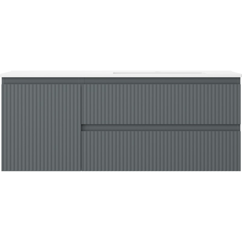 Specifikace produktu: Rozměry skříňky: Šířka: 120 cm Hloubka: 46 cm Výška: 47 cm Sada obsahuje: Zásuvková skříňka pod umyvadlo: Šířka: 80 cm Hloubka: 46 cm Výška: 47 cm Barva korpusu: Matný grafit Materiál korpusu: Lakovaná deska Barva čela: Matný grafit Materiál čela: Lakovaná MDF deska Konstrukce čela: Drážkovaná Počet zásuvek: 2 Prostorná zásuvka s funkcí tlumení dovírání Povrch odolný vůči UV záření Skříňka pod umyvadlo s dvířky: Šířka: 40 cm Výška: 47 cm Hloubka: 46 cm Barva korpusu: Matný grafit Materiál korpusu: Lakovaná deska Barva čela: Matný grafit Materiál čela: Lakovaná MDF deska Konstrukce čela: Drážkovaná Počet dvířek: 1 1 police Panty s funkcí tlumení dovírání Univerzální montáž dvířek (levé/pravé) Povrch odolný vůči UV záření Umyvadlo: Šířka: 121 cm Hloubka: 46,5 cm Výška: 16,5 cm Barva umyvadla: Matná bílá Materiál umyvadla: Konglomerát Otvor pro přepad: Ano Otvor pro baterii: Ano Smontovaný výrobek