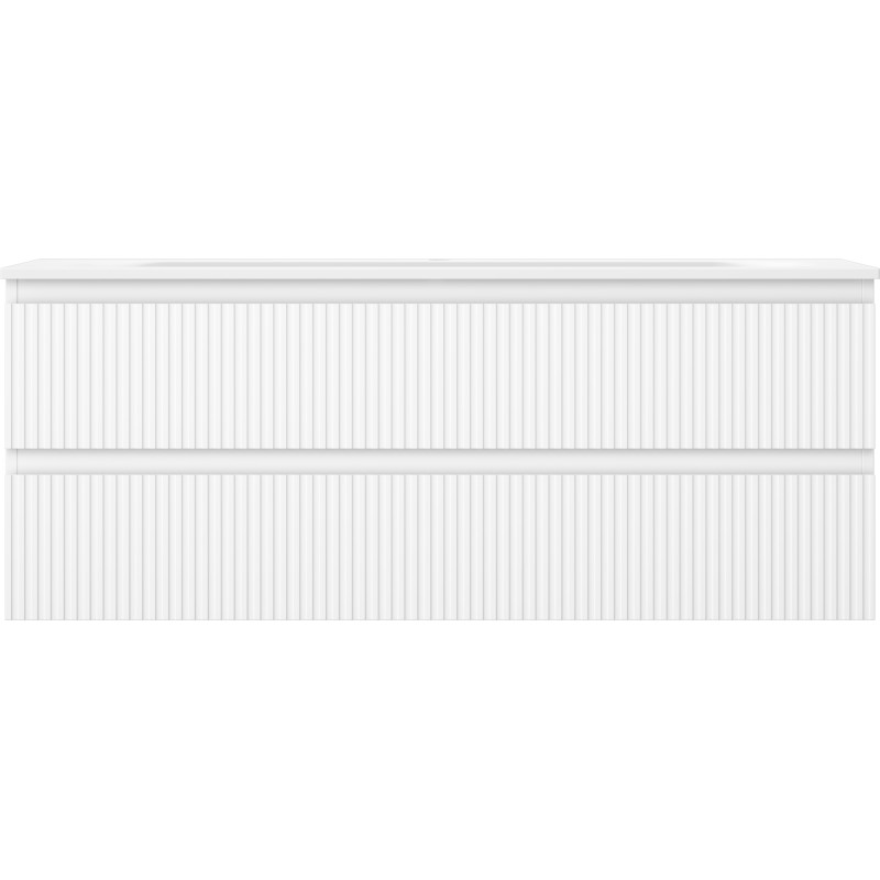 Specifikace produktu: Rozměry skříňky: Šířka: 120 cm Hloubka: 46 cm Výška: 47 cm Barva korpusu: Matná bílá Materiál korpusu: Lakovaná deska Barva čela: Matná bílá Materiál čela: Lakovaná MDF deska Struktura čela: Drážkovaná Počet zásuvek: 2 Prostorná zásuvka s funkcí tlumeného dovírání Povrch odolný vůči UV záření Rozměry umyvadla: Šířka: 121 cm Hloubka: 46,5 cm Výška: 16,5 cm Barva umyvadla: Matná bílá Materiál umyvadla: Konglomerát Otvor pro přepad: Ano Otvor pro baterii: Ano Smontovaný výrobek