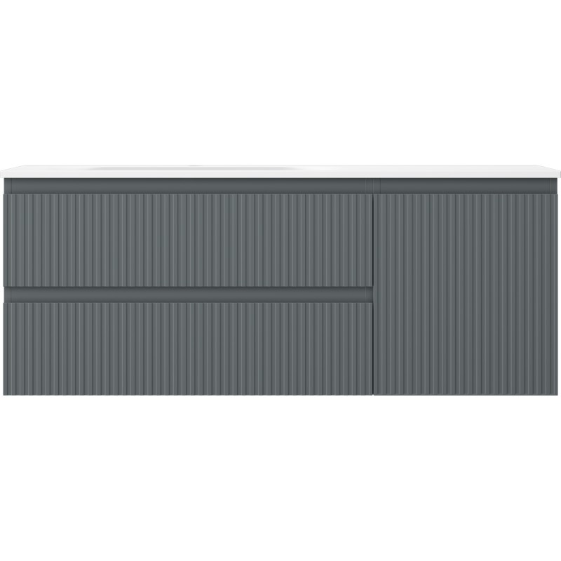 Specifikace produktu: Rozměry skříňky: Šířka: 120 cm Hloubka: 46 cm Výška: 47 cm Sada obsahuje: Zásuvková skříňka pod umyvadlo: Šířka: 80 cm Hloubka: 46 cm Výška: 47 cm Barva korpusu: Matný grafit Materiál korpusu: Lakovaná deska Barva čela: Matný grafit Materiál čela: Lakovaná MDF deska Konstrukce čela: Drážkovaná Počet zásuvek: 2 Prostorná zásuvka s funkcí tlumení dovírání Povrch odolný vůči UV záření Skříňka pod umyvadlo s dvířky: Šířka: 40 cm Výška: 47 cm Hloubka: 46 cm Barva korpusu: Matný grafit Materiál korpusu: Lakovaná deska Barva čela: Matný grafit Materiál čela: Lakovaná MDF deska Konstrukce čela: Drážkovaná Počet dvířek: 1 1 police Panty s funkcí tlumení dovírání Univerzální montáž dvířek (levé/pravé) Povrch odolný vůči UV záření Umyvadlo: Šířka: 121 cm Hloubka: 46,5 cm Výška: 16,5 cm Barva umyvadla: Matná bílá Materiál umyvadla: Konglomerát Otvor pro přepad: Ano Otvor pro baterii: Ano Smontovaný výrobek
