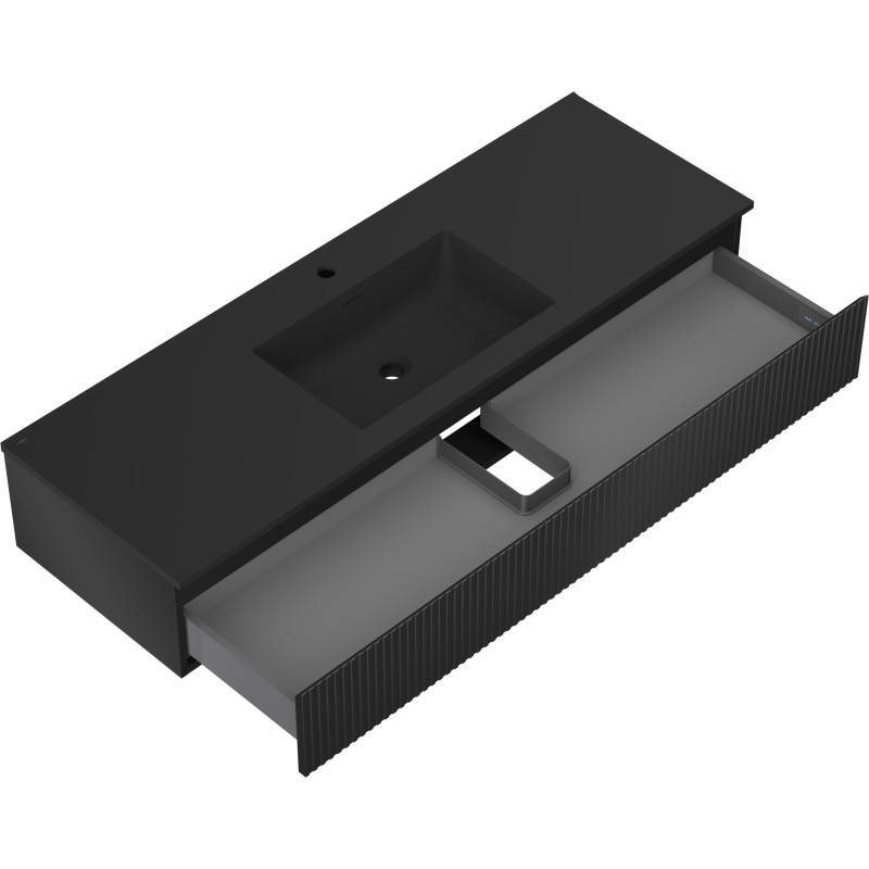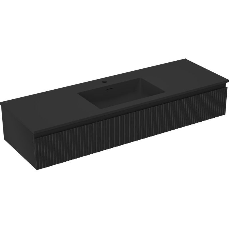 Specifikace produktu: Rozměry skříňky: Šířka: 140 cm Hloubka: 46 cm Výška: 23,5 cm Barva korpusu: Matná černá Materiál korpusu: Lakovaná deska Barva čela: Matná černá Materiál čela: Lakovaná MDF deska Struktura čela: Drážkovaná Počet zásuvek: 1 Prostorná zásuvka s funkcí tichého dovírání Povrch odolný vůči UV záření Rozměry umyvadla: Šířka: 141 cm Hloubka: 46,5 cm Výška: 16,5 cm Barva umyvadla: Matná černá Materiál umyvadla: Konglomerát Otvor pro přepad: Ano Otvor pro baterii: Ano Smontovaný výrobek
