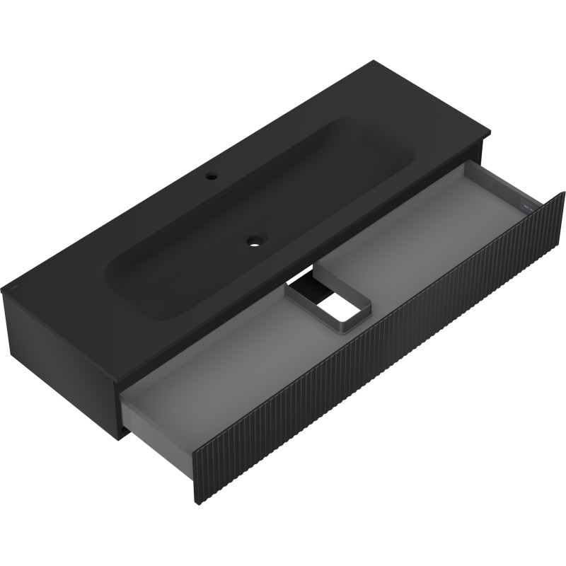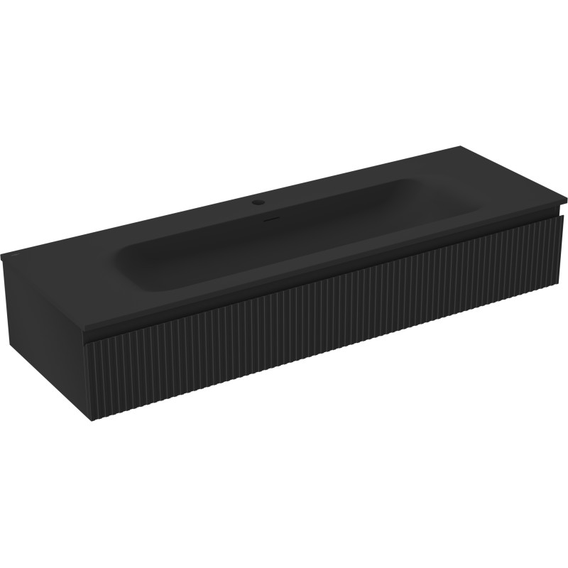 Specifikace produktu: Rozměry skříňky: Šířka: 140 cm Hloubka: 46 cm Výška: 23,5 cm Barva korpusu: Matná černá Materiál korpusu: Lakovaná deska Barva čela: Matná černá Materiál čela: Lakovaná MDF deska Struktura čela: Drážkovaná Počet zásuvek: 1 Prostorná zásuvka s funkcí tichého dovírání Povrch odolný vůči UV záření Rozměry umyvadla: Šířka: 141 cm Hloubka: 46,5 cm Výška: 16,5 cm Barva umyvadla: Matná černá Materiál umyvadla: Konglomerát Otvor pro přepad: Ano Otvor pro baterii: Ano Smontovaný výrobek