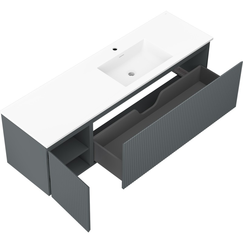Specifikace produktu: Rozměry skříňky: Šířka: 160 cm Hloubka: 46 cm Výška: 47 cm Sada obsahuje: Zásuvková skříňka pod umyvadlo: Šířka: 120 cm Hloubka: 46 cm Výška: 47 cm Barva korpusu: Matný grafit Materiál korpusu: Lakovaná deska Barva čela: Matný grafit Materiál čela: Lakovaná MDF deska Konstrukce čela: Drážkovaná Počet zásuvek: 1 Prostorná zásuvka s funkcí tlumení dovírání Povrch odolný vůči UV záření Skříňka pod umyvadlo s dvířky: Šířka: 40 cm Výška: 47 cm Hloubka: 46 cm Barva korpusu: Matný grafit Materiál korpusu: Lakovaná deska Barva čela: Matný grafit Materiál čela: Lakovaná MDF deska Konstrukce čela: Drážkovaná Počet dvířek: 1 1 police Panty s funkcí tlumení dovírání Univerzální montáž dvířek (levé/pravé) Povrch odolný vůči UV záření Umyvadlo: Šířka: 161 cm Hloubka: 46,5 cm Výška: 16,5 cm Barva umyvadla: Matná bílá Materiál umyvadla: Konglomerát Otvor pro přepad: Ano Otvor pro baterii: Ano Smontovaný výrobek