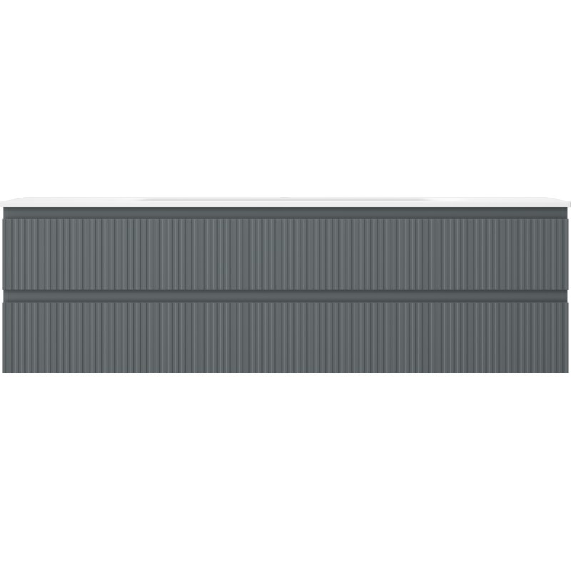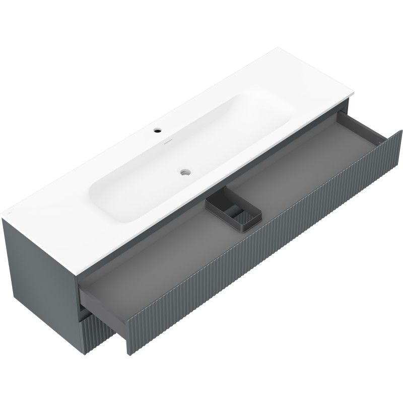 Specifikace produktu: Rozměry skříňky: Šířka: 160 cm Hloubka: 46 cm Výška: 47 cm Barva korpusu: Matný grafit Materiál korpusu: Lakovaná deska Barva čela: Matný grafit Materiál čela: Lakovaná MDF deska Struktura čela: Drážkovaná Počet zásuvek: 2 Prostorná zásuvka s funkcí tlumeného dovírání Povrch odolný vůči UV záření Rozměry umyvadla: Šířka: 161 cm Hloubka: 46,5 cm Výška: 16,5 cm Barva umyvadla: Matná bílá Materiál umyvadla: Konglomerát Otvor pro přepad: Ano Otvor pro baterii: Ano Smontovaný výrobek